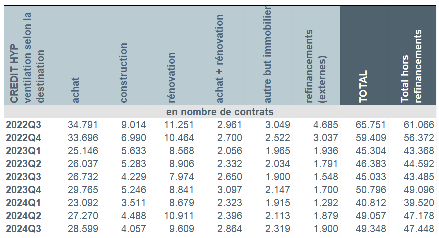 L’augmentation du nombre des demandes de crédit donne une image mixte pour les différentes destinations. Le nombre de demandes de crédit pour la construction d’un logement (-340) a diminué de -5,7%, celui pour la rénovation d’un logement a augmenté (+2.224, soit +23,3%). Le nombre de demandes de crédit pour l’achat + la rénovation d’un logement (-77 soit -1,8 %) enregistre une baisse. Le nombre des demandes de crédit pour d’autres destinations (terrain à bâtir, garage...) (+1.102 , soit + 40 %) et celui pour l’achat d’un logement (+1.909, soit + 4,7 %) ont enregistré une hausse. Par ailleurs, au cours du troisième trimestre de 2024, le nombre de demandes de refinancements externes a continué à diminuer, en l’occurrence de -12%.