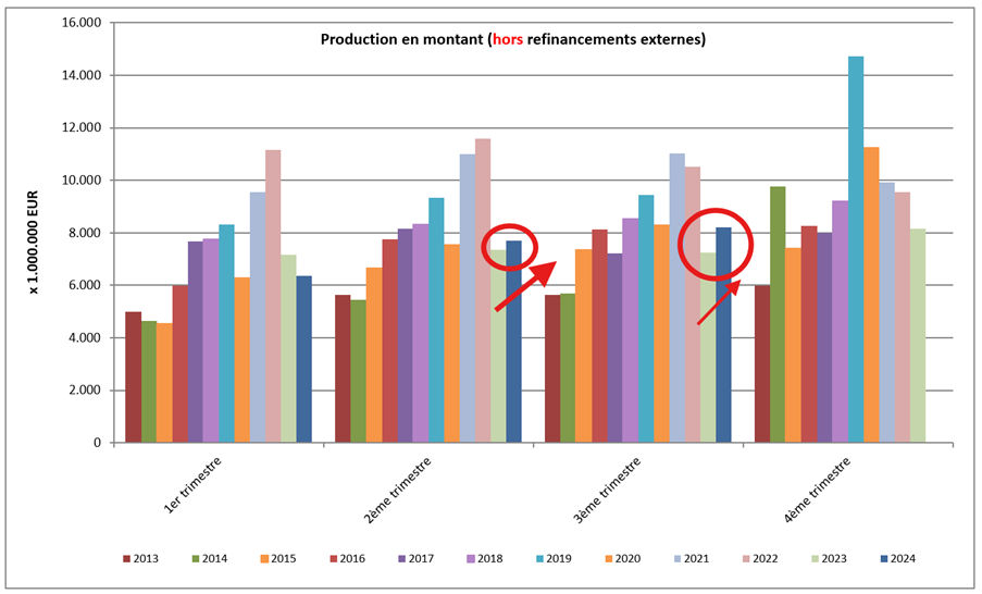 Sur la voie du 2e trimestre de 2024, au cours du troisième trimestre de 2024, le nombre de crédits octroyés, hors refinancements externes, a également connu une augmentation d’environ 9 % par rapport au troisième trimestre 2023. Le montant correspondant a quant à lui aussi enregistré une hausse d’environ 14%.