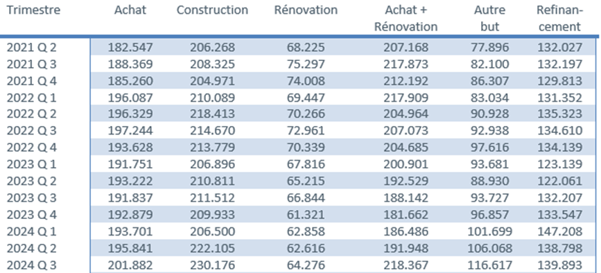 Le montant moyen emprunté pour l’achat d’un logement s’est quant à lui accru au troisième trimestre 2024 autour de 202.000 EUR. Le montant moyen pour un crédit de construction a également augmenté autour de 230.000 EUR au troisième trimestre 2024. Il en va de même pour le montant moyen d’un crédit pour achat + rénovation qui a augmenté et atteint environ 218.000 EUR.