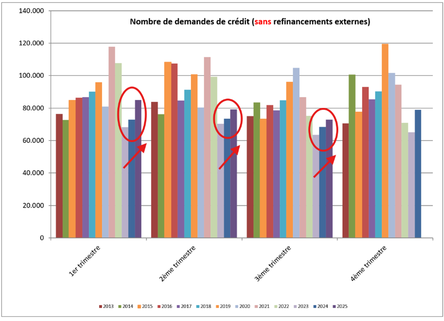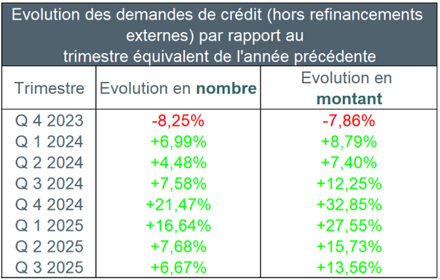 Au troisième trimestre 2025, le nombre de demandes de crédit a augmenté d’environ 6,7 % par rapport à la même période 2024, hors refinancements. Le montant de crédit correspondant durant ce troisième trimestre 2025 a également augmenté d’environ 13,5 %.