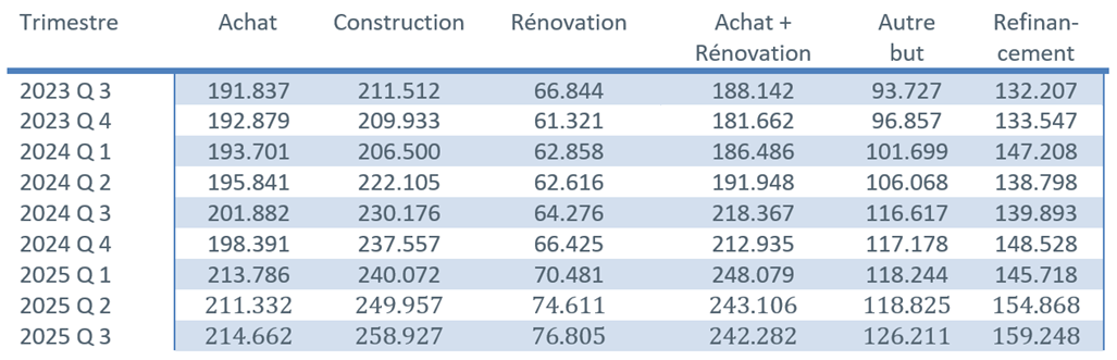 Le montant moyen emprunté pour l’achat d’un logement a poursuivi sa hausse au troisième trimestre 2025 autour de 215.000 EUR. Le montant moyen pour un crédit de construction a également augmenté autour de 259.000 EUR au troisième trimestre 2025. Cependant le montant moyen d’un crédit pour achat + rénovation a, lui, diminué et atteint environ 242.300 EUR.