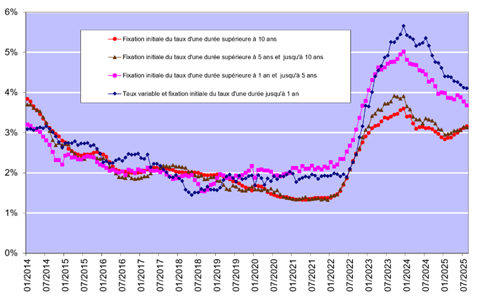 Les taux d'intérêt des crédits hypothécaires se sont stabilisés au cours du dernier trimestre. Sur la base des chiffres publiés par la Banque Nationale de Belgique, ces taux oscillaient en août entre en moyenne 4,11 % (pour les crédits assortis d’une période initiale de fixité du taux jusqu’à 1 an) et en moyenne 3,16 % (pour les crédits assortis d’une période initiale de fixité du taux de plus de 10 ans).