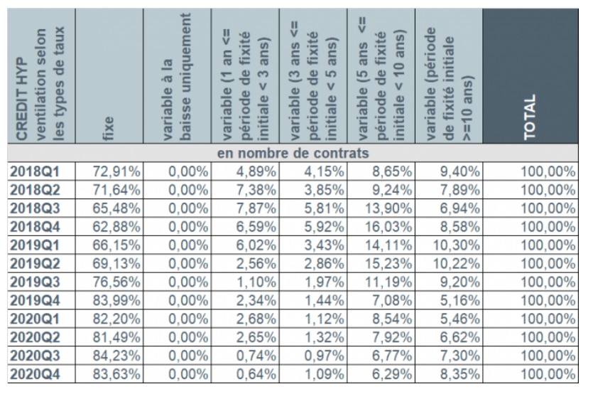 Également au cours du quatrième trimestre 2020, plus de 9 emprunteurs sur 10 (92%) ont à nouveau opté pour un taux d’intérêt fixe ou un taux d’intérêt variable assorti d’une période initiale de fixité des taux de minimum 10 ans. Un peu plus de 7% des emprunteurs ont privilégié un taux d’intérêt variable assorti d’une période initiale de fixité des taux entre 3 et 10 ans. Le nombre d’emprunteurs ayant choisi un taux variable annuellement a atteint à peine 0,6%.