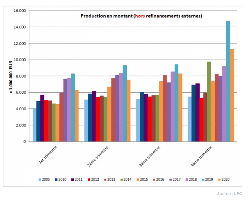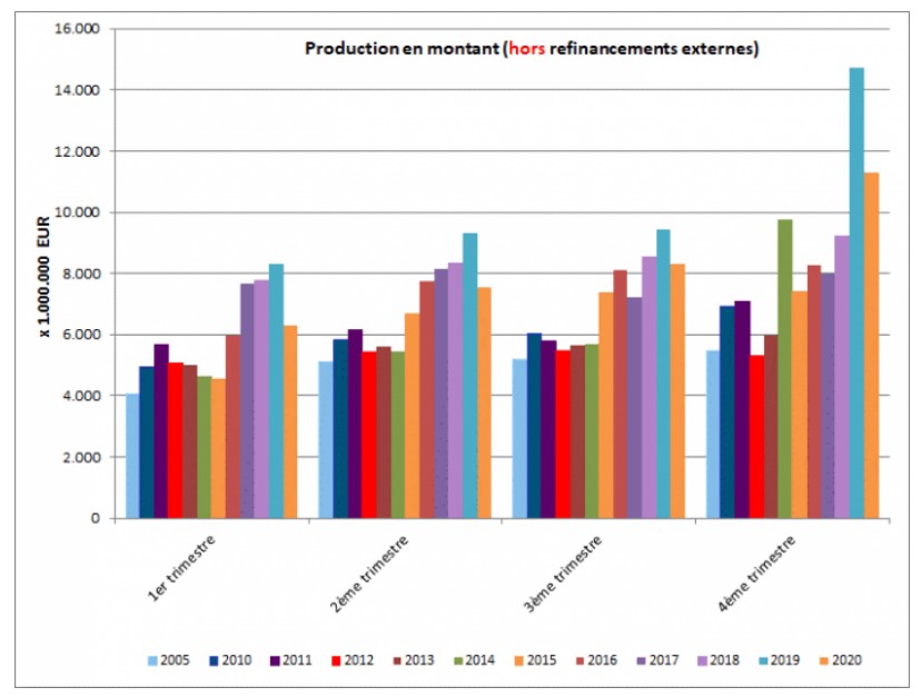 L’octroi de crédit a surtout rattrapé son retard au cours du dernier trimestre de 2020. Plus de 74.000 crédits ont été accordés (hors refinancements) pour un montant total de 11,3 milliards d'euros.