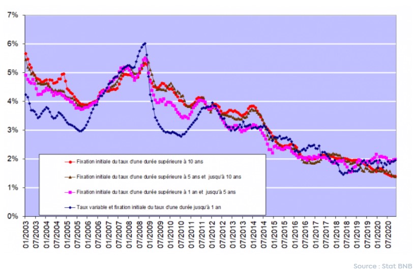 Tout au long de l’année 2020, et donc également au cours du dernier trimestre, les emprunteurs ont pu profiter des taux très bas des crédits hypothécaires. Sur la base des chiffres publiés par la Banque Nationale de Belgique, ces taux oscillaient en novembre entre 1,38% (pour les crédits à taux variable avec une période initiale de fixité du taux de plus de 5 ans et jusqu’à 10 ans) et 1,98% (pour les crédits avec une période initiale de fixité du taux de plus d’1 an et de moins de 5 ans).