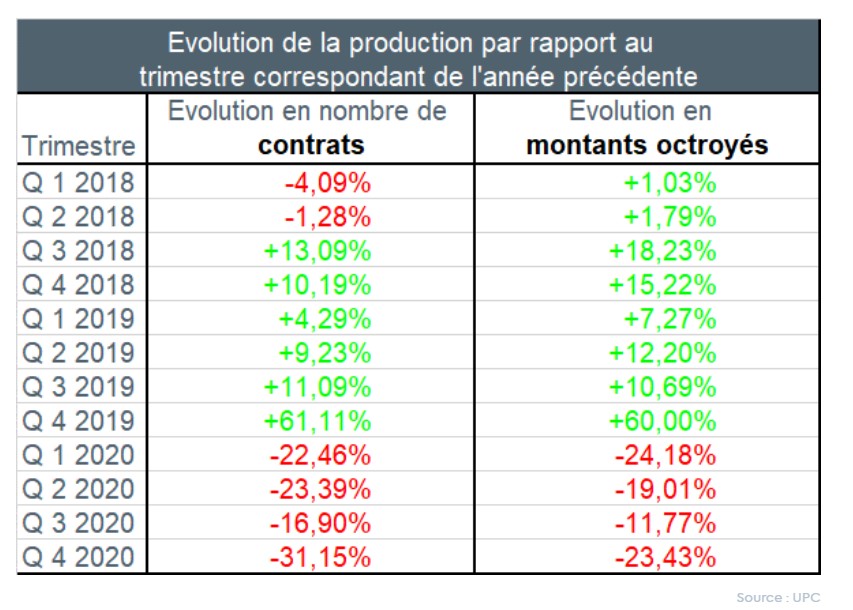 Mais par rapport au quatrième trimestre de l’année plus « normale » 2018, on note une augmentation du nombre de crédits octroyés de presque 11% et même de 22,5% du montant total octroyé, toutes destinations confondues.