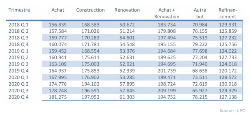 Le montant moyen d’un crédit de construction a continué à augmenter au quatrième trimestre 2020 pour atteindre presque 198.000 EUR. Ceci représente une augmentation de presque 30.000 EUR depuis début 2018.