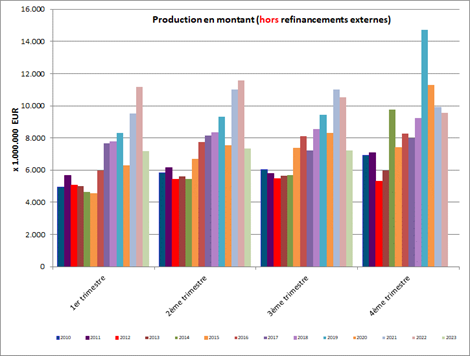 Comme durant les trimestres précédents, au cours du troisième trimestre de 2023, le nombre de crédits octroyés, hors refinancements externes, a également connu une diminution d’environ 29% par rapport au troisième trimestre 2022. Le montant correspondant a quant à lui aussi enregistré une baisse d’environ 31%.