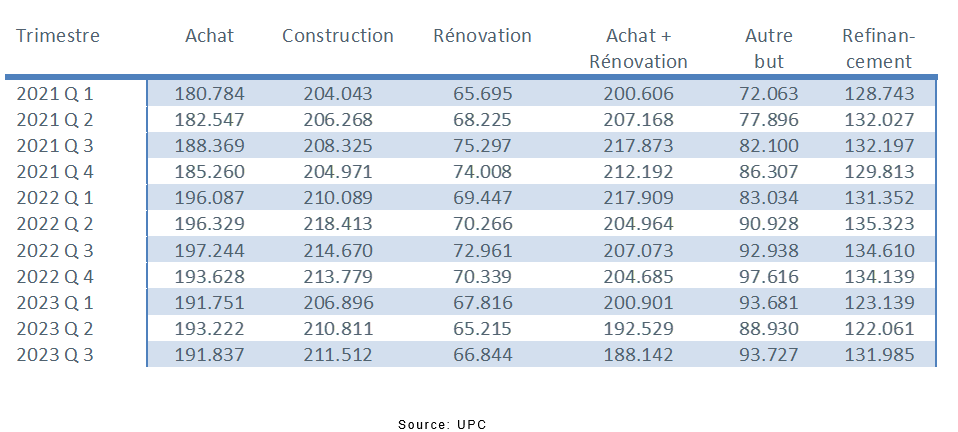 Le montant moyen emprunté pour l’achat d’un logement s’est quant à lui stabilisé au troisième trimestre 2023 autour de 192.000 EUR. Le montant moyen pour un crédit de construction est également resté stable autour de 211.000 EUR au troisième trimestre 2023. En revanche, le montant moyen d’un crédit pour achat + rénovation a continué à diminuer, pour tomber à environ 188.000 EUR.