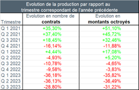 Globalement, le nombre de crédits octroyés s’est contracté d’environ 29% par rapport au troisième trimestre de 2022. Cette diminution est observable pour toutes les destinations.