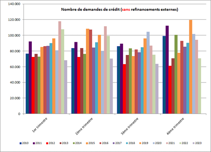 Le nombre de demandes de crédit, hors celles relatives aux refinancements externes, a connu au troisième trimestre 2023 une diminution d’environ 15,5% par rapport au même trimestre de l’année précédente. Le montant sous-jacent des demandes de crédit a également signé une diminution d’environ 14,5%. Pour le troisième trimestre consécutif, le nombre de demandes de crédit pour les trimestres visés (celles pour les refinancements n’étant pas reprises) se situe ainsi au niveau le plus bas depuis 2010.