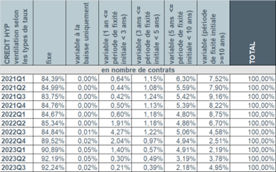 Au cours du troisième trimestre 2023, la grande majorité des emprunteurs (97%) ont continué d’opter pour un taux d’intérêt fixe ou un taux d’intérêt variable assorti d’une période initiale de fixité des taux de minimum 10 ans. Dans à peine 0,2% des cas, les emprunteurs ont encore opté pour des crédits assortis d’un taux d’intérêt variable annuellement.