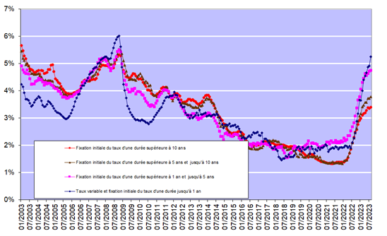 Les taux d'intérêt des crédits hypothécaires ont poursuivi leur tendance à la hausse au cours du dernier trimestre. Sur la base des chiffres publiés par la Banque Nationale de Belgique, ces taux oscillaient en août entre en moyenne 5,26% (pour les crédits assortis d’une période initiale de fixité du taux jusqu’à 1 an) et en moyenne 3,40% (pour les crédits assortis d’une période initiale de fixité du taux de plus de 10 ans).