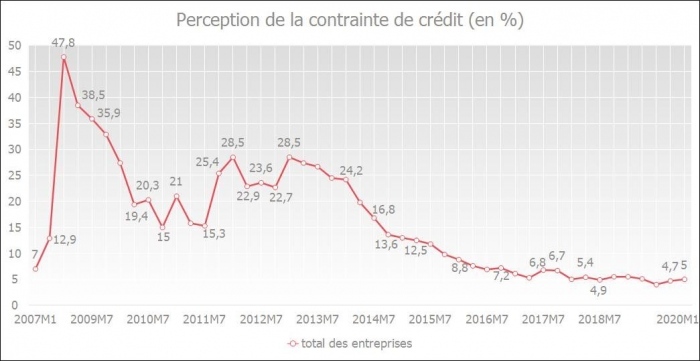 L'enquête trimestrielle menée par la Banque nationale de Belgique (BNB) montre que la perception des freins au crédit par les entreprises a légèrement augmenté mais reste très faible. En janvier 2020, ce sont 5,0 % des entreprises qui jugeaient les conditions de crédit défavorables, contre 4,7 % en octobre 2019 et 4,0 % en juillet 2019.