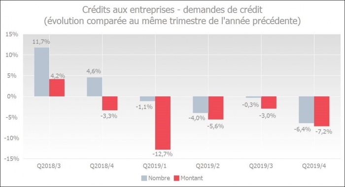 Au quatrième trimestre de 2019, les entrepreneurs ont demandé 6,4 % de crédits de moins qu'à la même période de l'année précédente. C'est là la quatrième baisse consécutive. En termes de montant, la contraction a été plus importante : avec 7,2 % de tassement, c’est la cinquième diminution consécutive enregistrée au niveau des montants.