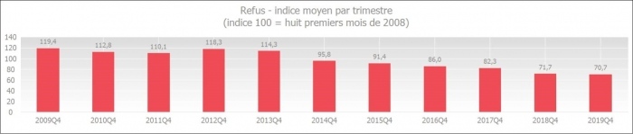 Le degré de refus pour le quatrième trimestre de 2019 est le plus bas jamais enregistré depuis le début des mesures trimestrielles en 2009.