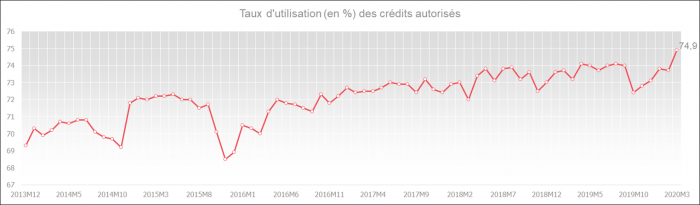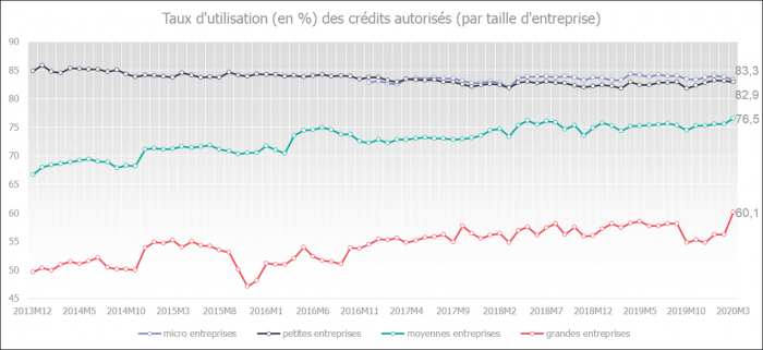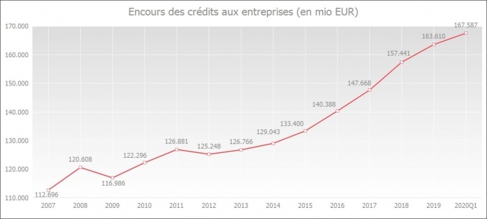 En mars 2020, l'encours des crédits aux entreprises utilisés (y compris les crédits d'engagement, par exemple les crédits de garantie et les crédits documentaires) a atteint un niveau record de 167,6 milliards d'euros.