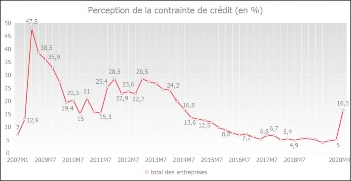 L'enquête trimestrielle menée par la BNB montre que la perception des freins au crédit par les entreprises (c’est-à-dire la manière dont les entreprises perçoivent les conditions de crédit, soit les taux d’intérêt, les autres coûts bancaires, le volume de crédit et les garanties demandées) a augmenté. Ce pourcentage est passé de 5 % en janvier 2020 à 16,3 % en avril 2020, mais il reste largement inférieur à celui de la crise bancaire de 2008-2009, où l’on avait observé un pic de près de 50 %.
