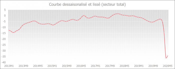 La courbe désaisonnalisée et lissée ci-dessous reflète la tendance conjoncturelle sous-jacente. Une baisse de la courbe témoigne d’un tassement de la confiance des entreprises.
