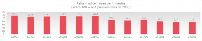 Le degré de refus pour le premier trimestre de 2020 se situe, par comparaison avec tous les premiers trimestres, au deuxième niveau le plus bas depuis le début des mesures en 2009.