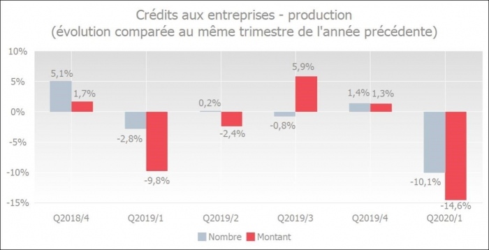 Le nombre de crédits accordés a diminué au premier trimestre 2020 de 10,1 % par rapport au même trimestre de l'année précédente. Les montants octroyés ont chuté de 14,6 %.