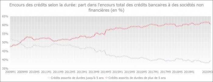 L'encours total des crédits aux entreprise utilisés n'a jamais été aussi élevé que ces derniers mois. En mars 2020, il a augmenté pour atteindre 167,6 milliards d'euros. Les entreprises utilisent donc plus que jamais leurs lignes de crédit existantes.