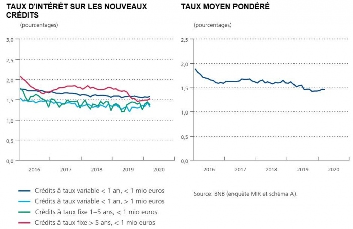 Le taux d'intérêt moyen pondéré sur les nouveaux crédits aux entreprises est resté faible. Selon les données de la BNB, le taux d'intérêt moyen pondéré sur les nouveaux crédits aux entreprises a très légèrement baissé en mars 2020 pour atteindre 1,46% (contre 1,47% en février 2020).