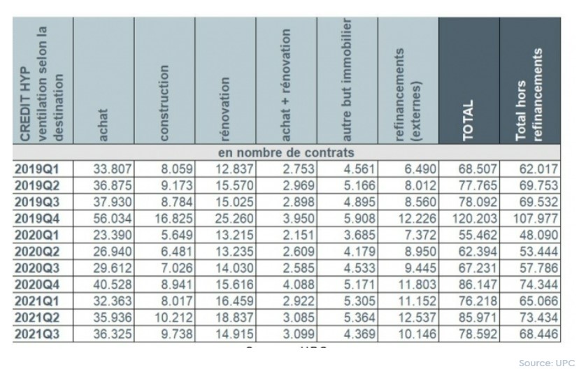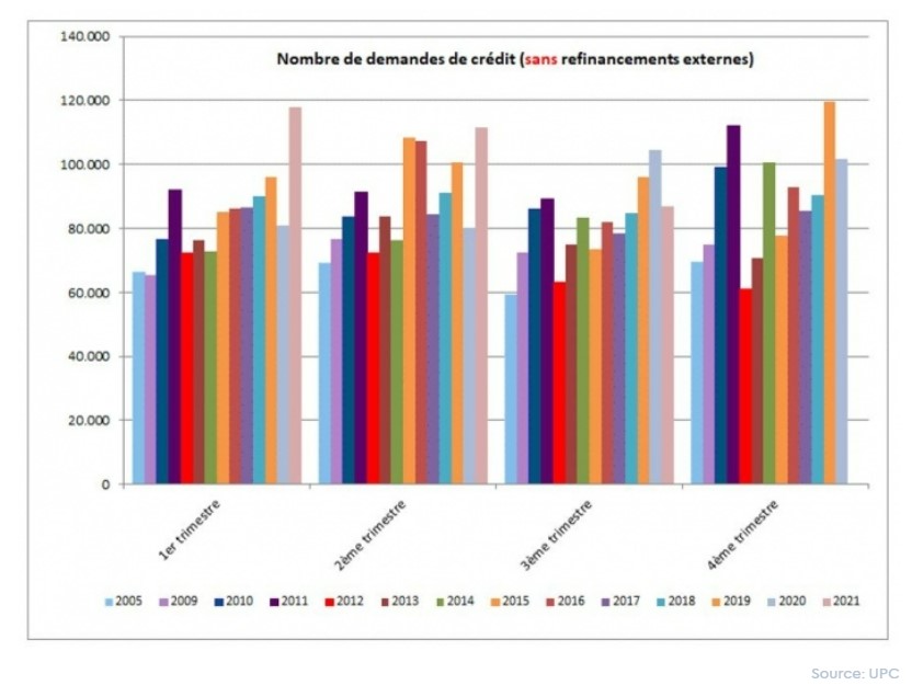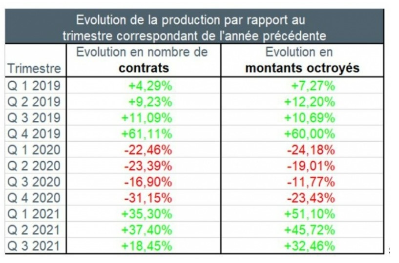 Le nombre de demandes de crédit a connu au troisième trimestre 2021 une diminution d’environ 17%, hors refinancements, par rapport au troisième trimestre de 2020. Il est à noter que ce troisième trimestre 2020 faisait directement suite à la levée du confinement, ce qui avait entraîné une reprise des demandes de crédit. Le montant de crédit correspondant durant ce troisième trimestre 2021 a également enregistré une diminution, d’environ 12,5%.