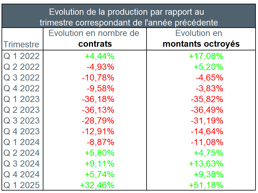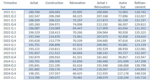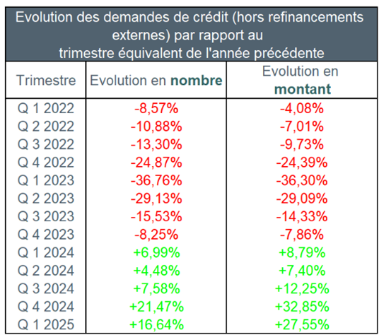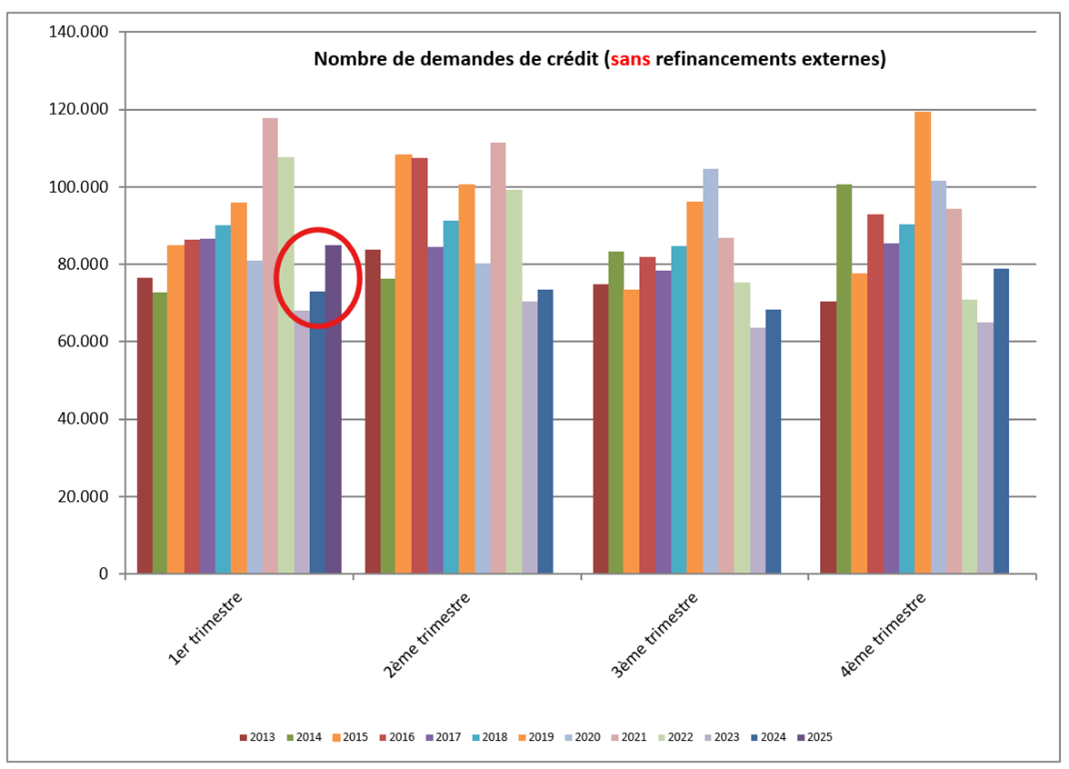 Au premier trimestre de 2025, le nombre de demandes de crédit s’est envolé de presque 17%, hors refinancements. Le montant de crédit correspondant durant ce premier trimestre 2025 a également augmenté d’environ 27,5%.