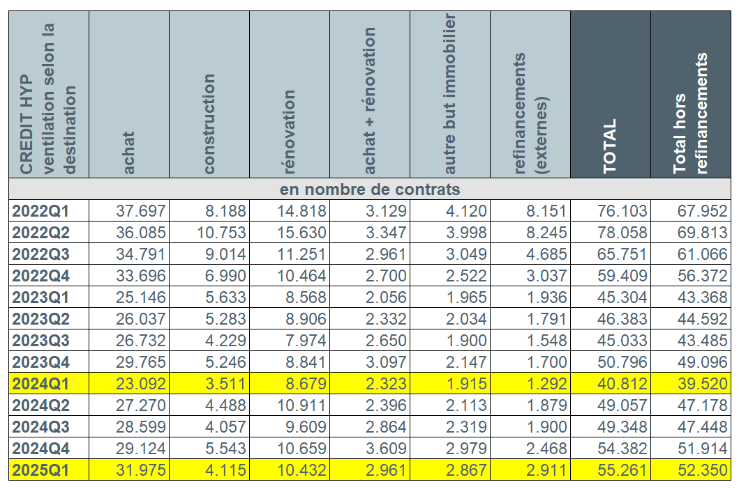 Au premier trimestre 2025, environ 52.500 contrats de crédit hypothécaire ont été conclus pour un montant total d’un peu plus de 9,6 milliards EUR (hors refinancements).