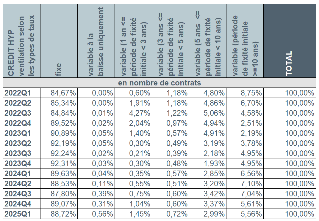 Au cours du premier trimestre 2024, plus de 9 emprunteurs sur 10 (94,3%) ont à nouveau opté pour un taux d’intérêt fixe ou un taux d’intérêt variable assorti d’une période initiale de fixité des taux de minimum 10 ans. Environ 3,7% des emprunteurs ont privilégié un taux d’intérêt variable assorti d’une période initiale de fixité des taux entre 3 et 10 ans. Environ 2% des emprunteurs ont choisi un taux variable annuellement.