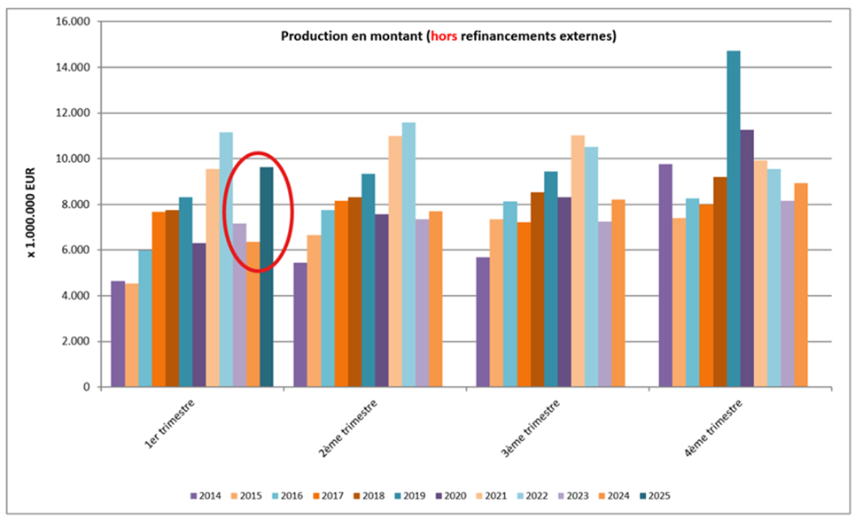 Au premier trimestre 2025, un peu plus de 52.300 nouveaux crédits ont été octroyés pour un montant total dépassant 9,6 milliards EUR – hors refinancements externes. Ce nombre est similaire à celui connu en 2020. En montant octroyé lors d’un premier trimestre, le niveau est égal à celui octroyé en 2021.