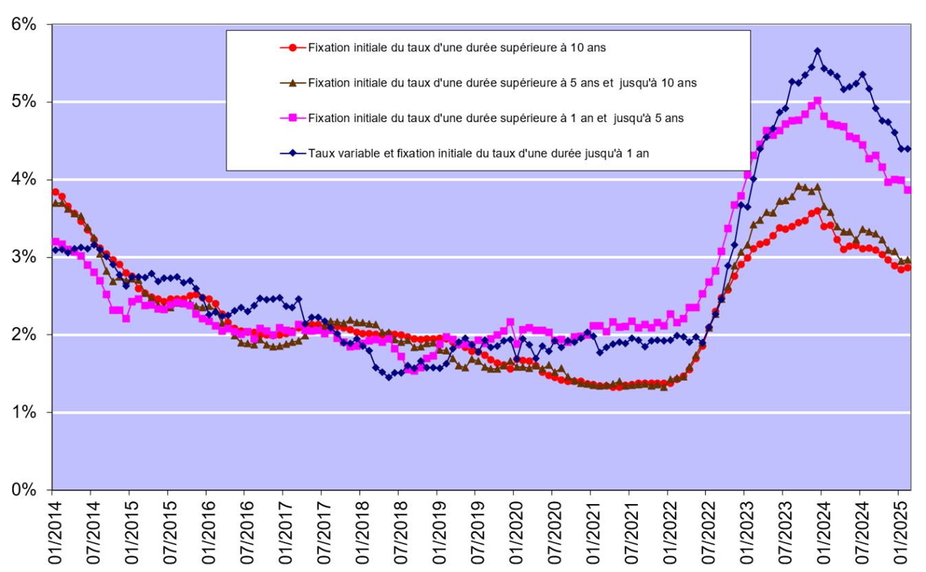 Le premier trimestre 2025 a été marqué par une baisse des taux d'intérêt des crédits hypothécaires. Sur la base des chiffres publiés par la Banque nationale de Belgique, ces taux oscillaient en février 2025 entre en moyenne 2,87% (pour les crédits assortis d’une période initiale de fixité du taux de plus de 10 ans) et en moyenne 4,40% (pour les crédits assortis d’une période initiale de fixité du taux de 1 an).