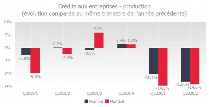 L'enquête trimestrielle réalisée par la Banque nationale de Belgique (BNB) indique que la perception des freins au crédit par les entreprises était de 14,9 % en juillet 2020. Le pourcentage est passé de 5,0 % en janvier à 16,3 % en avril, pour redescendre à 14,9 % en juillet. Cette évolution montre que la perception des freins au crédit est toujours significativement plus faible que durant la crise bancaire de 2008 - 2009, où elle a atteint un pic de près de 50 %.
