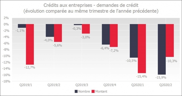 La crise du coronavirus a clairement ébranlé la confiance des entreprises. Compte tenu de la période d'incertitude économique, les entreprises investissent moins. Les chiffres montrent ainsi qu'au deuxième trimestre 2020, le nombre de demandes de crédits de la part des entreprises a été nettement inférieur à celui de la même période de 2019. Par rapport au même trimestre de l'an dernier, le montant demandé a diminué de 10,3 %.