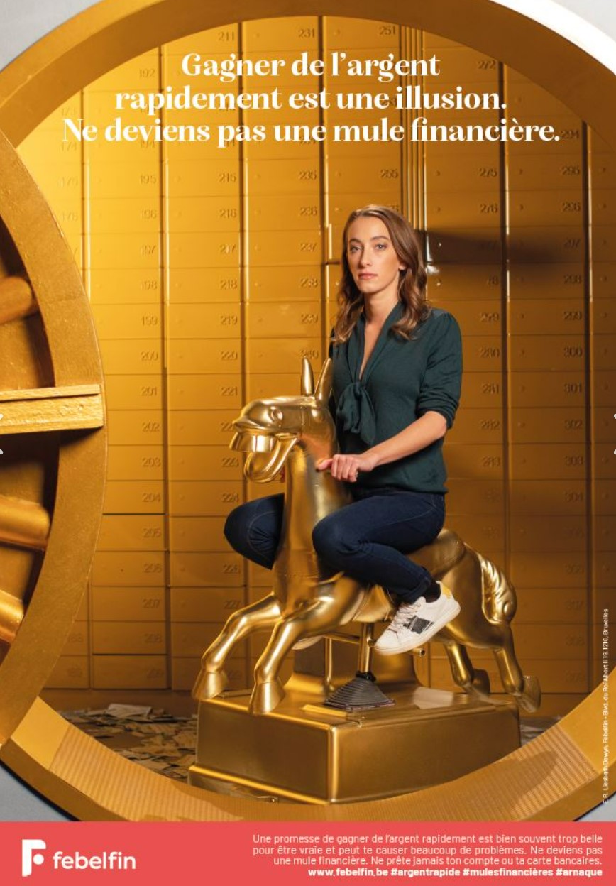 La réalité est moins rose : la mule fait le sale boulot des criminels, mais à la fin, c’est elle qui récolte les ennuis. La mule est en effet passible de poursuites. Pour mettre en garde les jeunes, Febelfin lance pour la troisième année consécutive une campagne autour des mules financières. Dans les vidéos, Sophie Maréchal (La Trêve) et Liandra Sadzo (LikeMe, Police de quartier, ...) évoquent les conséquences désastreuses de cette pratique.