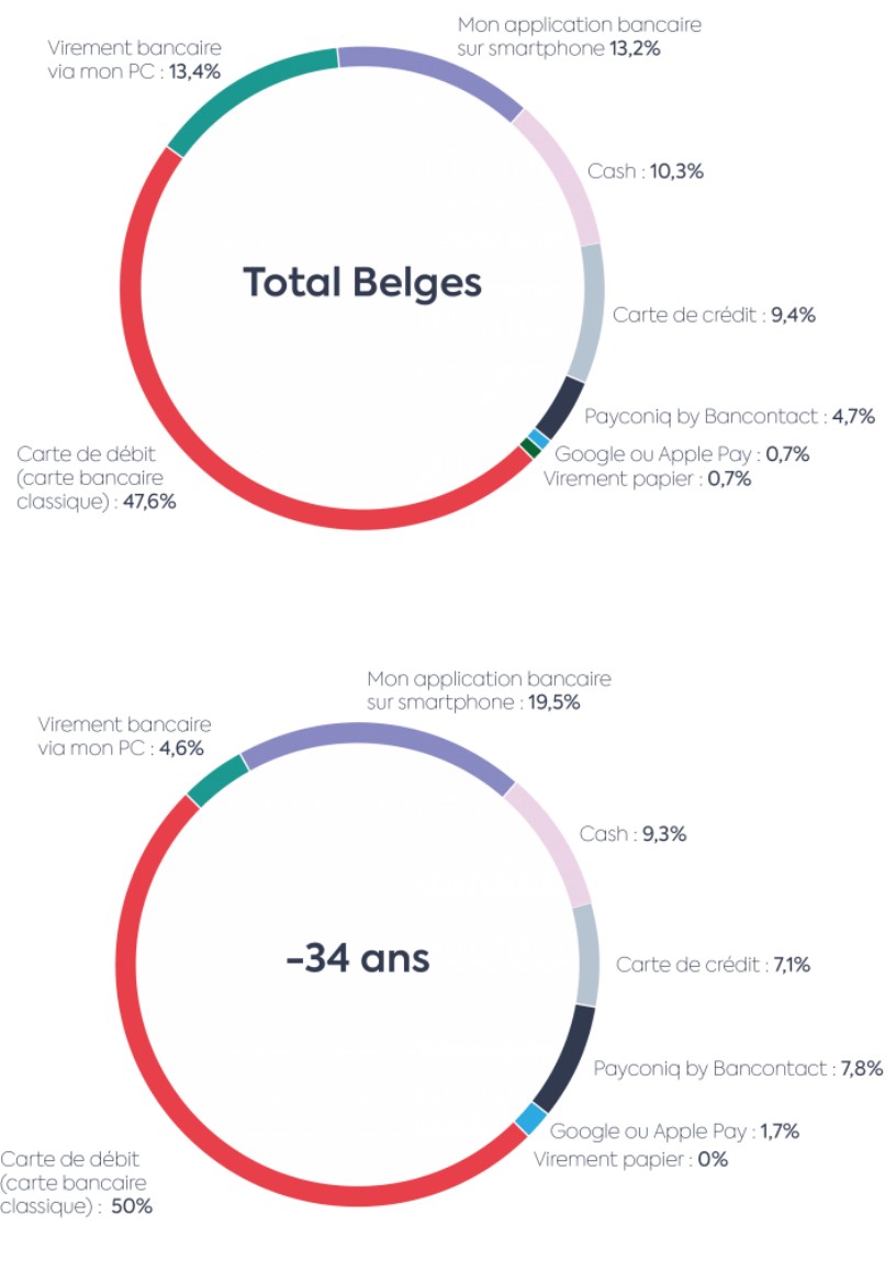 Près de la moitié des Belges préfèrent payer par carte de débit. Par ailleurs, environ 19% préfèrent les paiements par applications (bankapp, Payconiq by Bancontact, Google ou Apple Pay) et 9,4% préfèrent utiliser leur carte de crédit. Les applications de paiement sont encore plus populaires parmi les Belges âgés de moins de 34 ans. Dans cette tranche de la population, ce sont 29% des Belges qui préfèrent les paiements par application. Dans notre pays, les paiements mobiles sont en hausse. En effet, Bancontact Payconiq Company a enregistré pas moins de 34 millions de paiements mobiles l'an dernier, soit deux fois plus qu’en 2017.