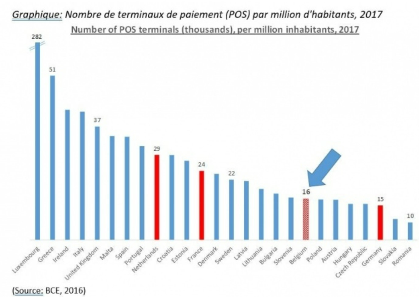 Les chiffres de la Banque centrale européenne confirment également que les commerçants belges ont encore du retard à rattraper. Selon la BCE, la Belgique compte 16 000 terminaux de paiement par million d'habitants. Cela signifie que notre pays se trouve en queue de peloton européen. À titre de comparaison, le Danemark compte 23 000 terminaux de paiement par million d'habitants et les Pays-Bas se classent, quant à eux, en tête de peloton avec 29 000 terminaux de paiement par million d'habitants.