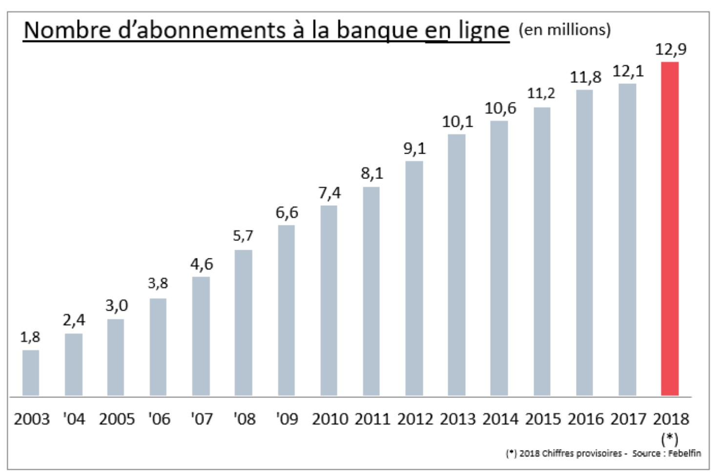 La banque en ligne continue de croître d'année en année. A la fin de l'an dernier, on notait pas moins de 12,9 millions d'abonnements. Si nous remontons quinze ans en arrière, les services bancaires en ligne étaient encore extrêmement limités. Ainsi, en 2003, on totalisait seulement 1,8 million d'abonnements.