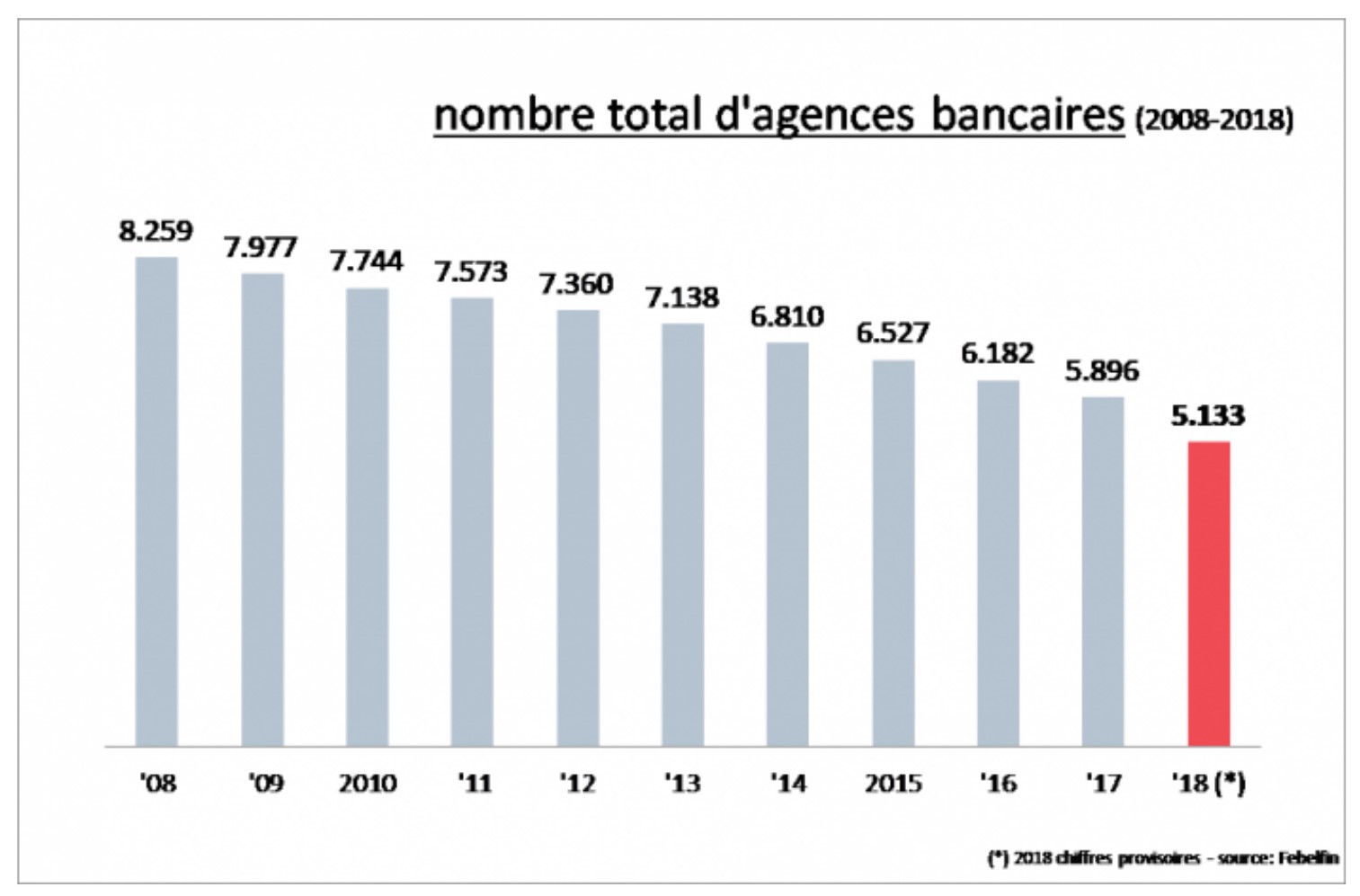 Fin 2018, la Belgique comptait 5133 agences bancaires.