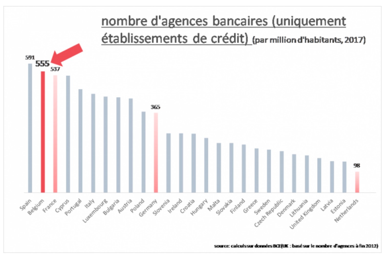 La Belgique dispose ainsi d'un des réseaux d’agences parmi les plus denses d'Europe : avec 555 agences par million d'habitants, elle n’est suivie que par l'Espagne. Les Pays-Bas comptent 98 agences par million d'habitants, soit un sixième du nombre d’agences en Belgique.