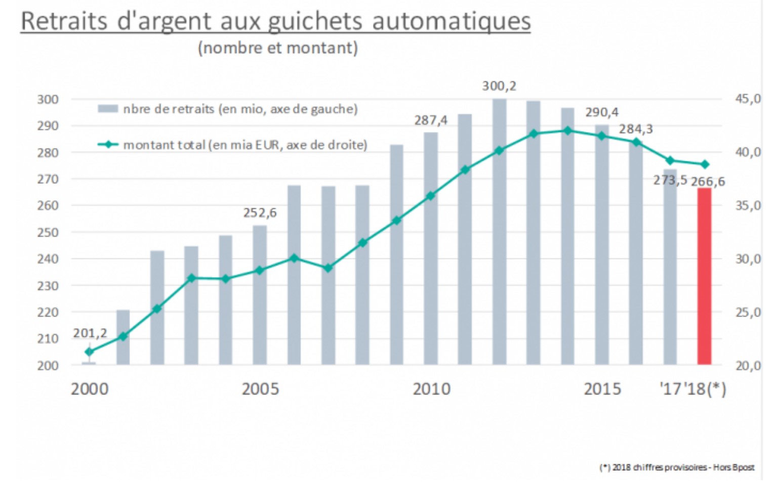 Face à cette tendance, on retrouve encore les paiements en espèces et les retraits associés. En 2018, les Belges ont retiré 23 fois de l'argent à la banque, pour un montant moyen de 145,7 euros. Depuis quelques années, le nombre de retraits et le montant retiré n'ont cessé de diminuer.