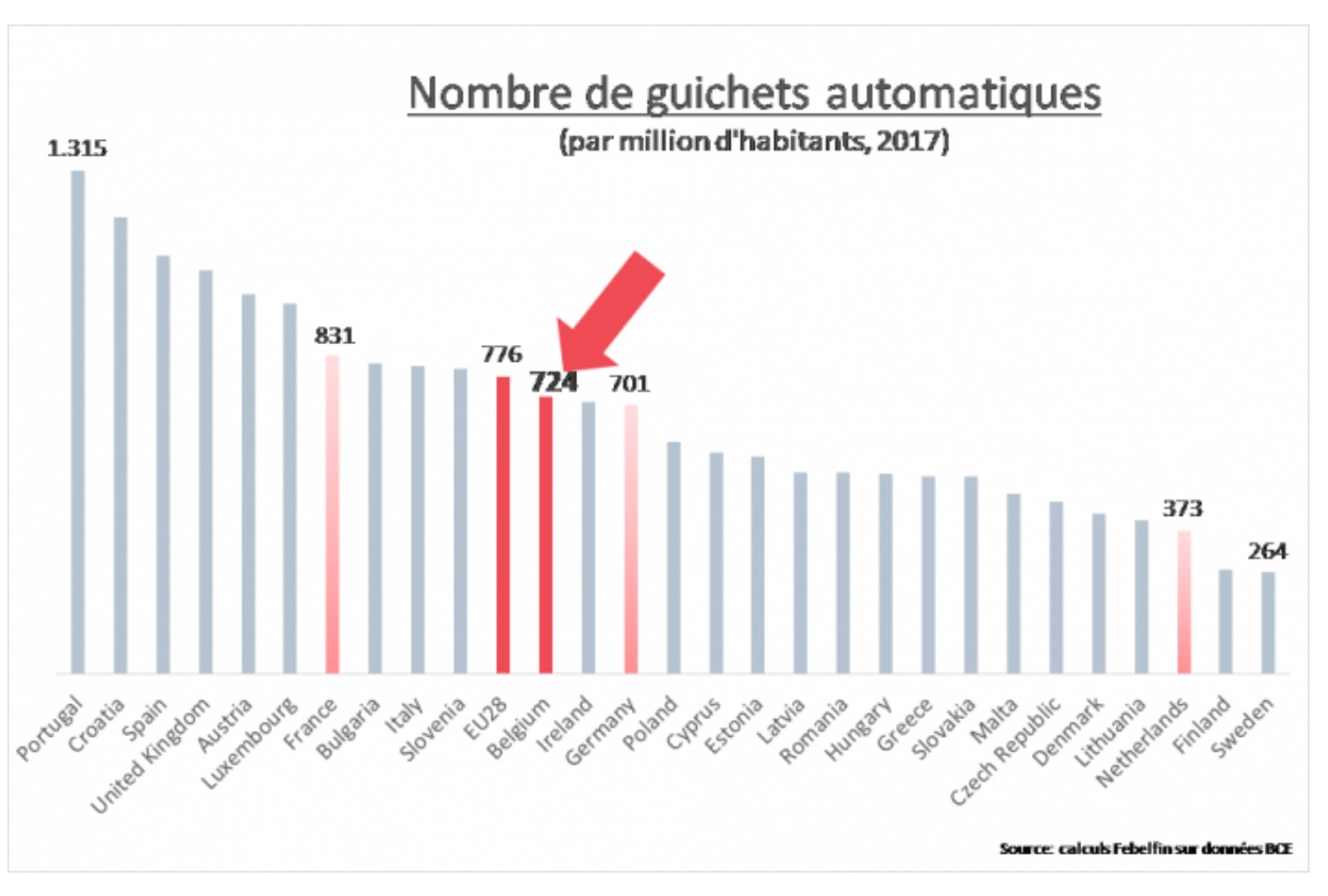 Sur la base d’une comparaison européenne, le nombre de distributeurs automatiques de billets en Belgique est proche de la moyenne. La situation dans notre pays est toutefois spécifique. Dans les pays du Sud, le nombre de guichets automatiques est beaucoup plus élevé, mais la banque numérique en est encore à ses débuts. Dans les pays du Nord, et aux Pays-Bas, par exemple, il faut faire plus d'efforts pour trouver un guichet automatique, mais la banque numérique fait - pour ainsi dire - partie de l'ADN de la population. Les banques belges offrent les meilleurs ingrédients des deux recettes : la possibilité de retirer de l'argent à un distributeur automatique couplée à un environnement de paiement numérique de haut niveau.