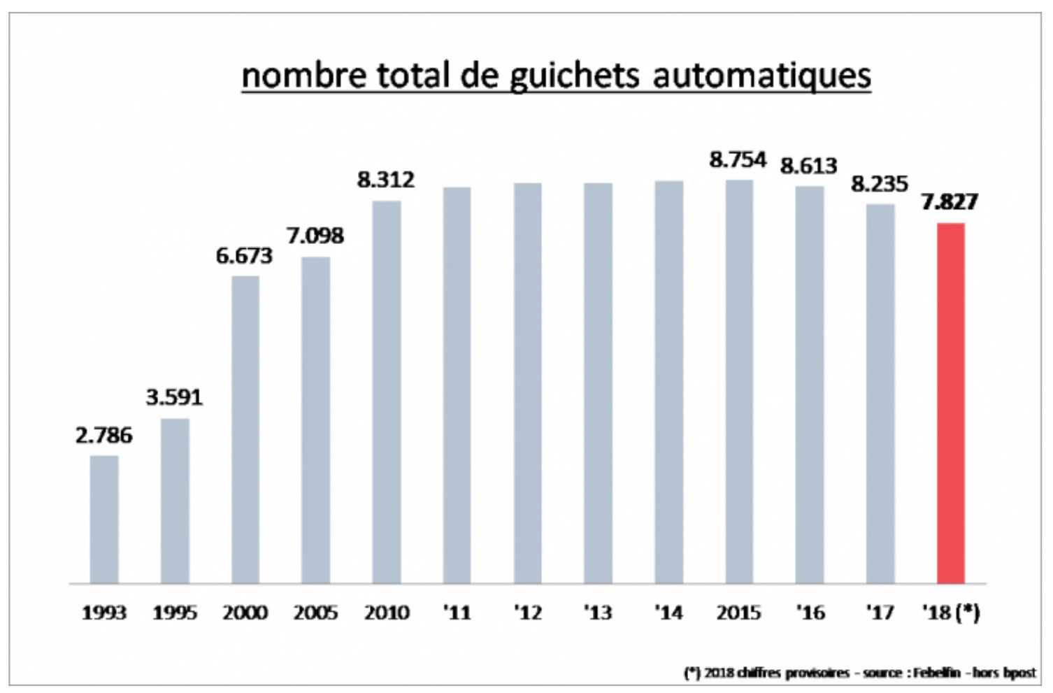 Le nombre de guichets automatiques auprès desquels les clients peuvent retirer de l'argent suit cette évolution. Depuis quelques années, leur nombre a légèrement diminué. Néanmoins, les Belges peuvent encore retirer de l'argent auprès de 7827 distributeurs automatiques de billets. Par rapport à il y a dix ans, le nombre de guichets automatiques est même plus élevé aujourd'hui.