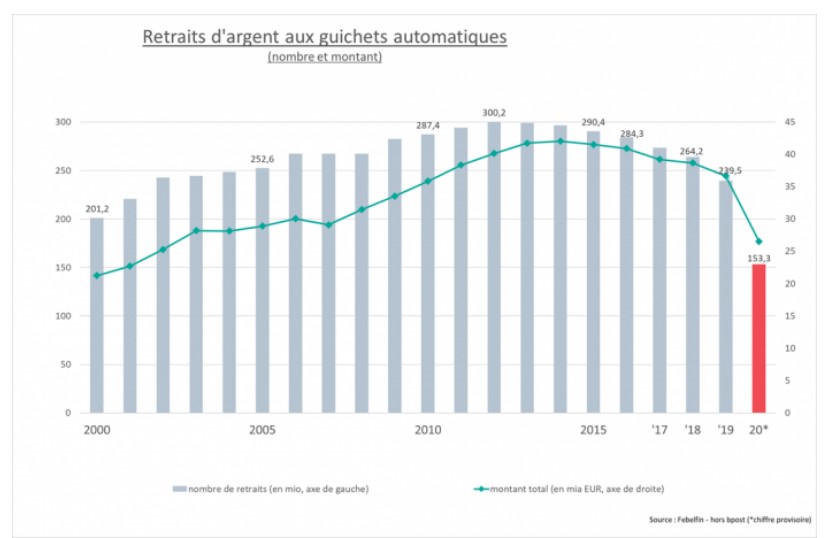 En 2020, nous avons assisté à une importante évolution à la baisse du nombre de retraits d'espèces aux distributeurs automatiques. Le nombre de retraits a ainsi diminué de plus d'un tiers (36%) par rapport à l'année précédente. En termes de montant retiré, la baisse a été de 28%. Si l'on compare avec 2012, le nombre de retraits d'espèces a diminué de moitié environ. La tendance à la réduction des retraits d’espèces s’observait depuis un certain temps déjà, mais elle semble maintenant connaître une accélération. Le gouvernement entend également contraindre les commerçants et les professions libérales à proposer dans l'avenir un mode de paiement numérique en plus des espèces.