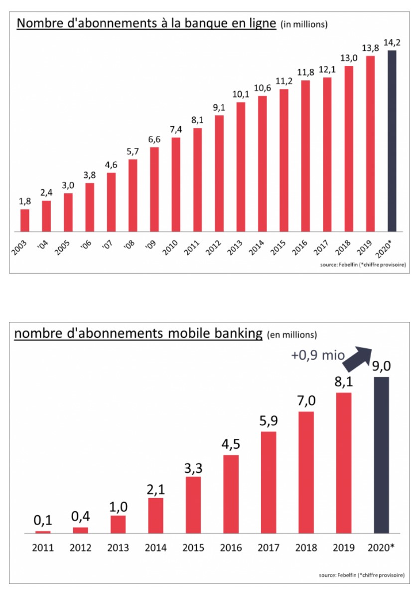En outre, la crise du coronavirus a eu pour effet de faire passer plus de personnes encore au numérique. L'« app-étit » pour les applications bancaires numériques est donc bien présent, comme le montrent les chiffres ci-dessous.