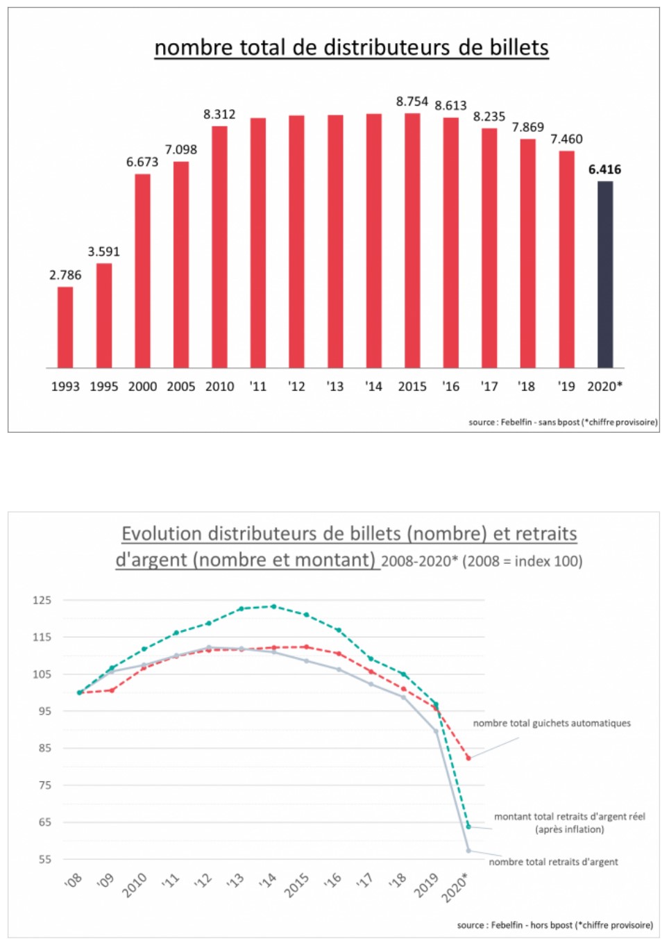 Néanmoins, la demande de liquidités demeure, et l'accès aux liquidités est un objectif essentiel du secteur financier. En Belgique, le réseau de distributeurs automatiques de billets est toujours important. Ainsi, en 2020, les Belges avaient accès à 6416 distributeurs automatiques de billets exploités par les banques, ce qui représente une baisse de 14 % par rapport à l'année précédente. Par ailleurs, deux initiatives sont actuellement en cours de déploiement, avec Batopin et Jofico, en vue d’assurer un accès continu aux distributeurs automatiques de billets pour tous.