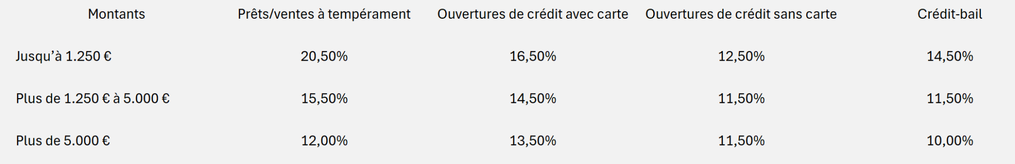 Le tableau ci-dessous contient les TAEG maximaux actuellement en vigueur.