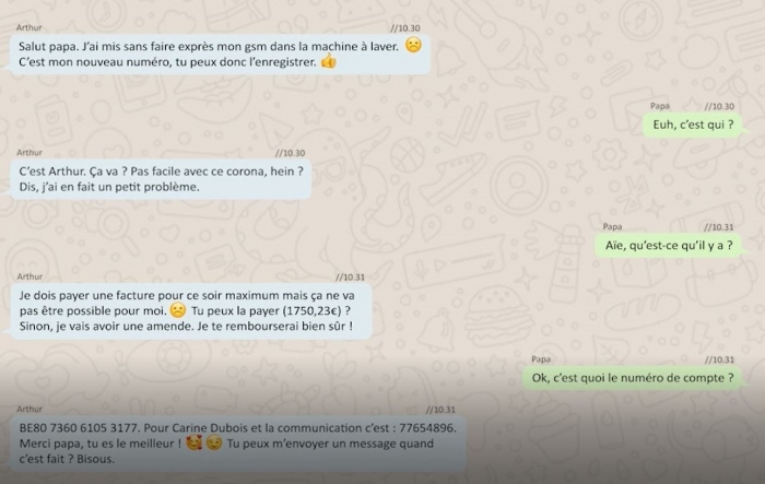 Les fraudeurs ont souvent le même mode opératoire. D'une façon ou d'une autre, ils réussissent à accéder à vos données. Ils vous envoient ensuite un message au nom d'un proche parent ou ami. Bien sûr, ils inventent d'abord une excuse à ce contact inattendu via un numéro inconnu. Par exemple : « Désolé, j'ai perdu mon smartphone. Ceci est mon nouveau numéro ».