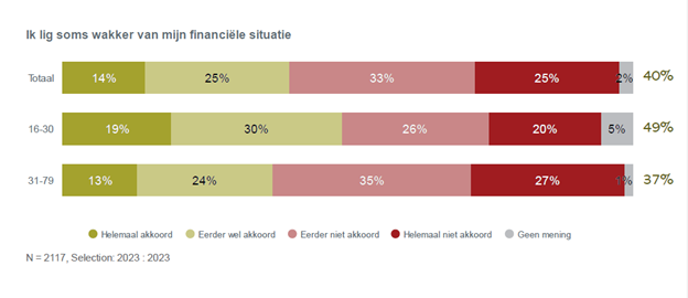 Wat financiële zorgen betreft, zeggen jongeren dat ze zich meer zorgen maken over hun financiële situatie dan de rest van de bevolking. Bijna de helft (49%) zegt wel eens slaap te verliezen, vergeleken met 37% van de 31-79-jarigen.